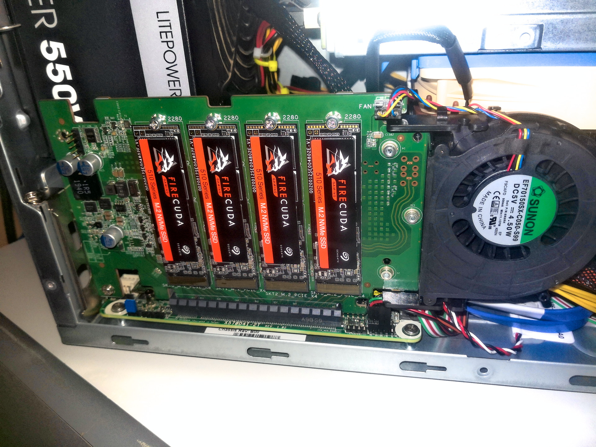 Pictured are 4 Seagate NVMe drives but these were returned due to firmware incompatibility with Illumos. They were replaced with Samsung 980 PRO drives and have been operating without issue. They are arranged in a ZFS raid10 array to form a 2TB pool.